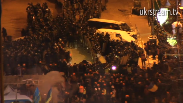 En la calle Institútskaya, cerca del Maidán, se registran enfrentamientos entre los manifestantes y los agentes de la Berkut. La Policía está equipada con cañones de agua.